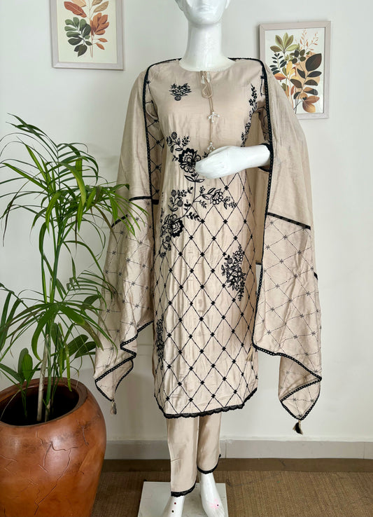 Beige Beauty Silk Kurta with Black Embroidery Set