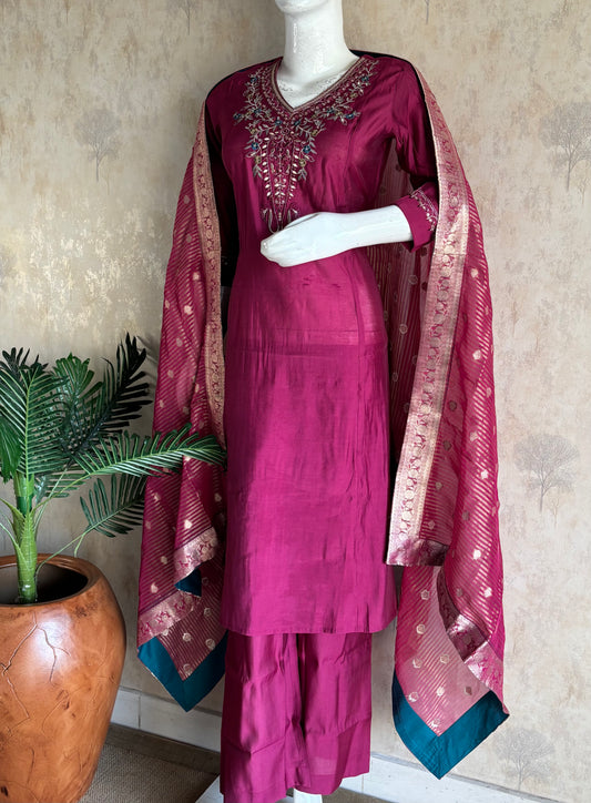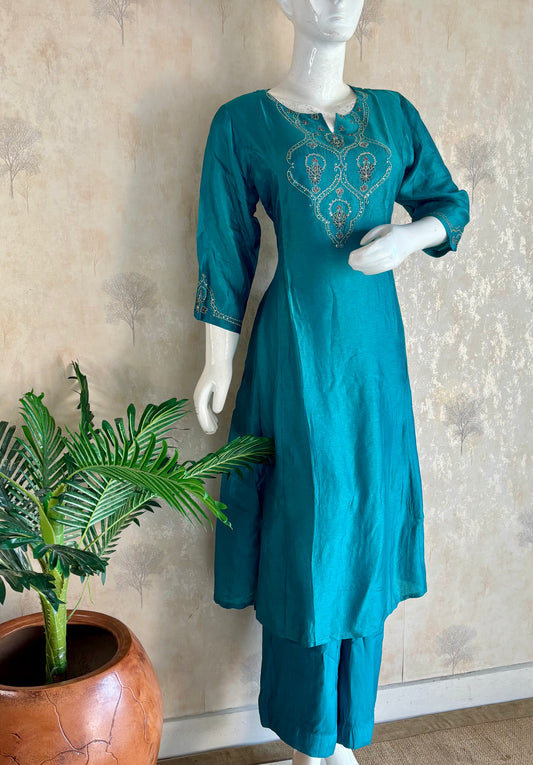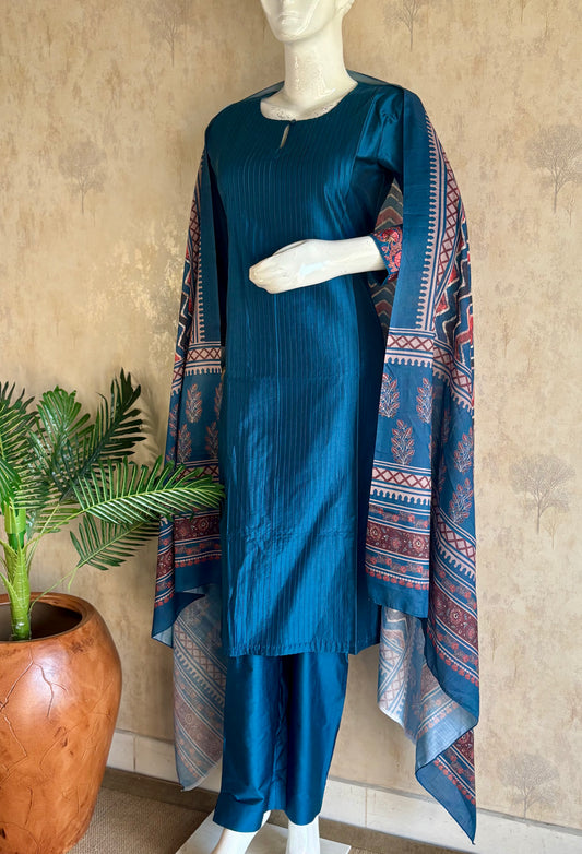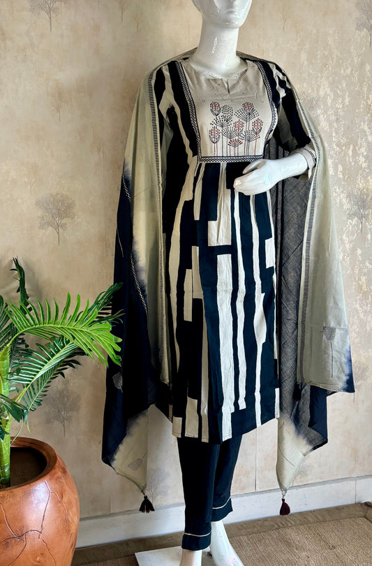 Silk A-Line Kurta Set with Ajrakh Handblock Panel