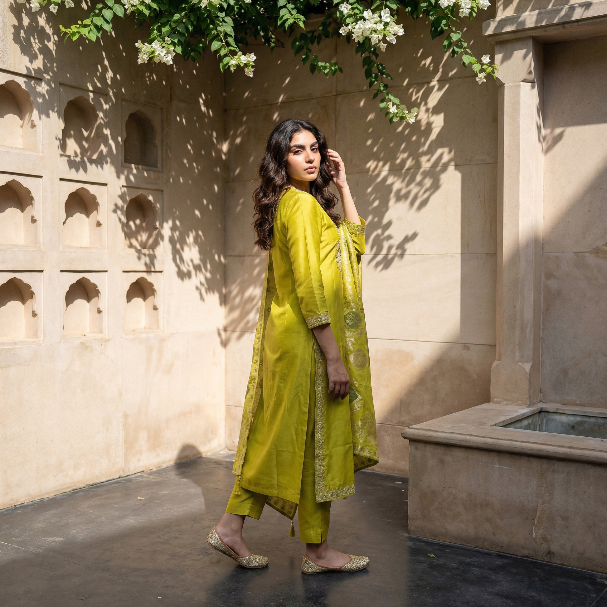 * Solid-coloured kurta with pants and meenakari-jacquard weave silk dupatta
