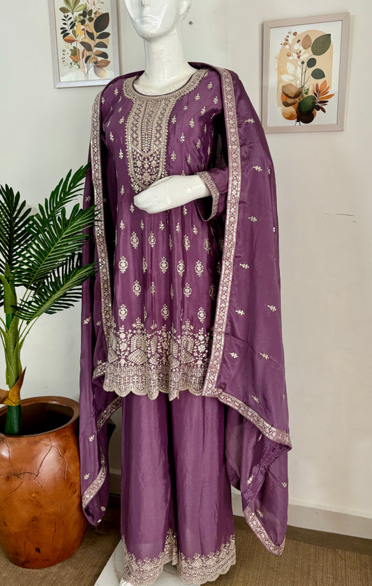 Lavender Pure Chinon Silk Short Anarkali Set with Intricate Silver Thread Embroidery