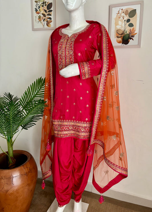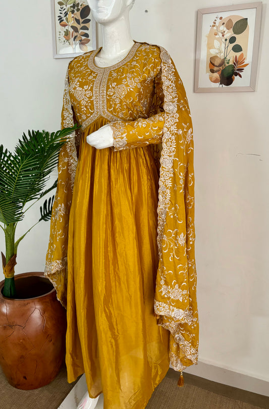 Regal Elegance: Golden Mustard Pure Silk Gown with Embroidered Dupatta