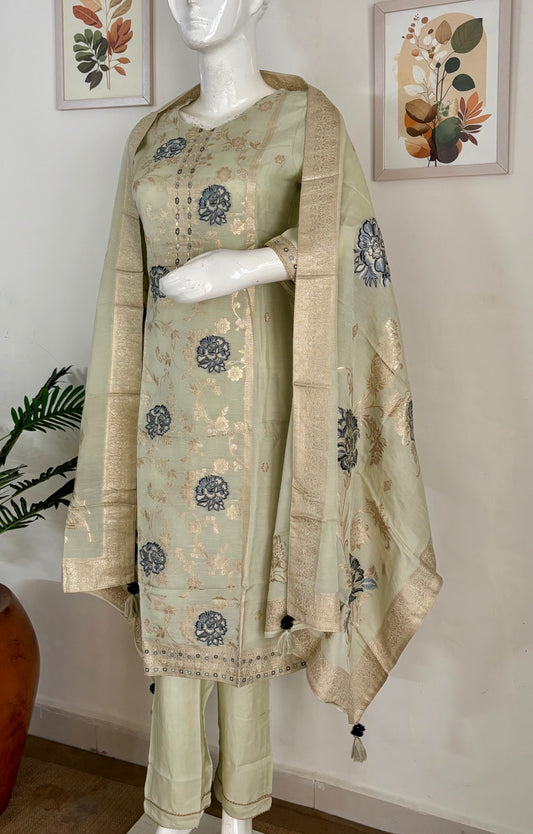 Pastel Green Silk Elegance β Banarasi & Jaamdani Kurta Set