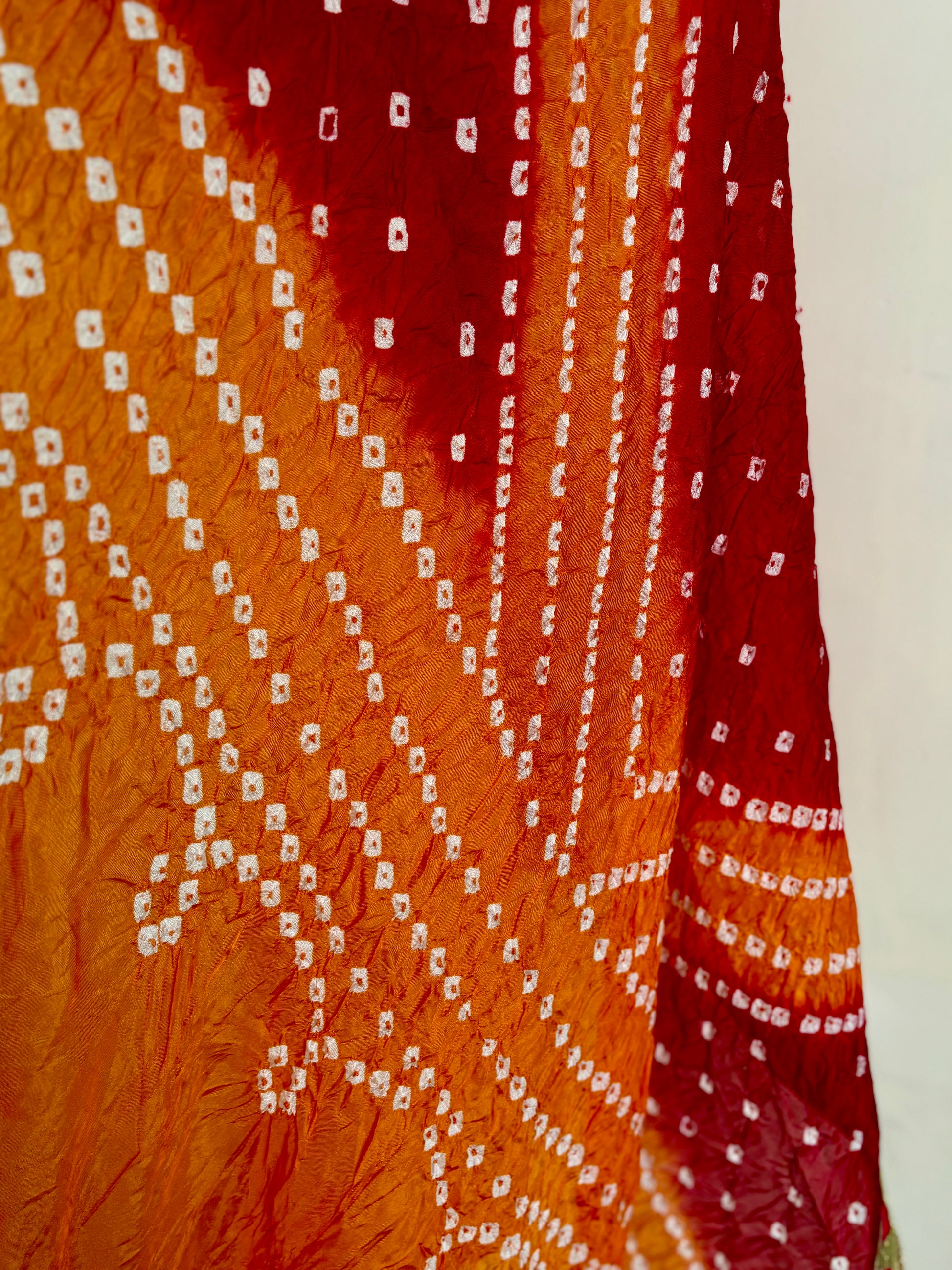 Fabric & Print: A plush Bhandhani print blends rich reds and oranges with traditional tie-dye artistry.