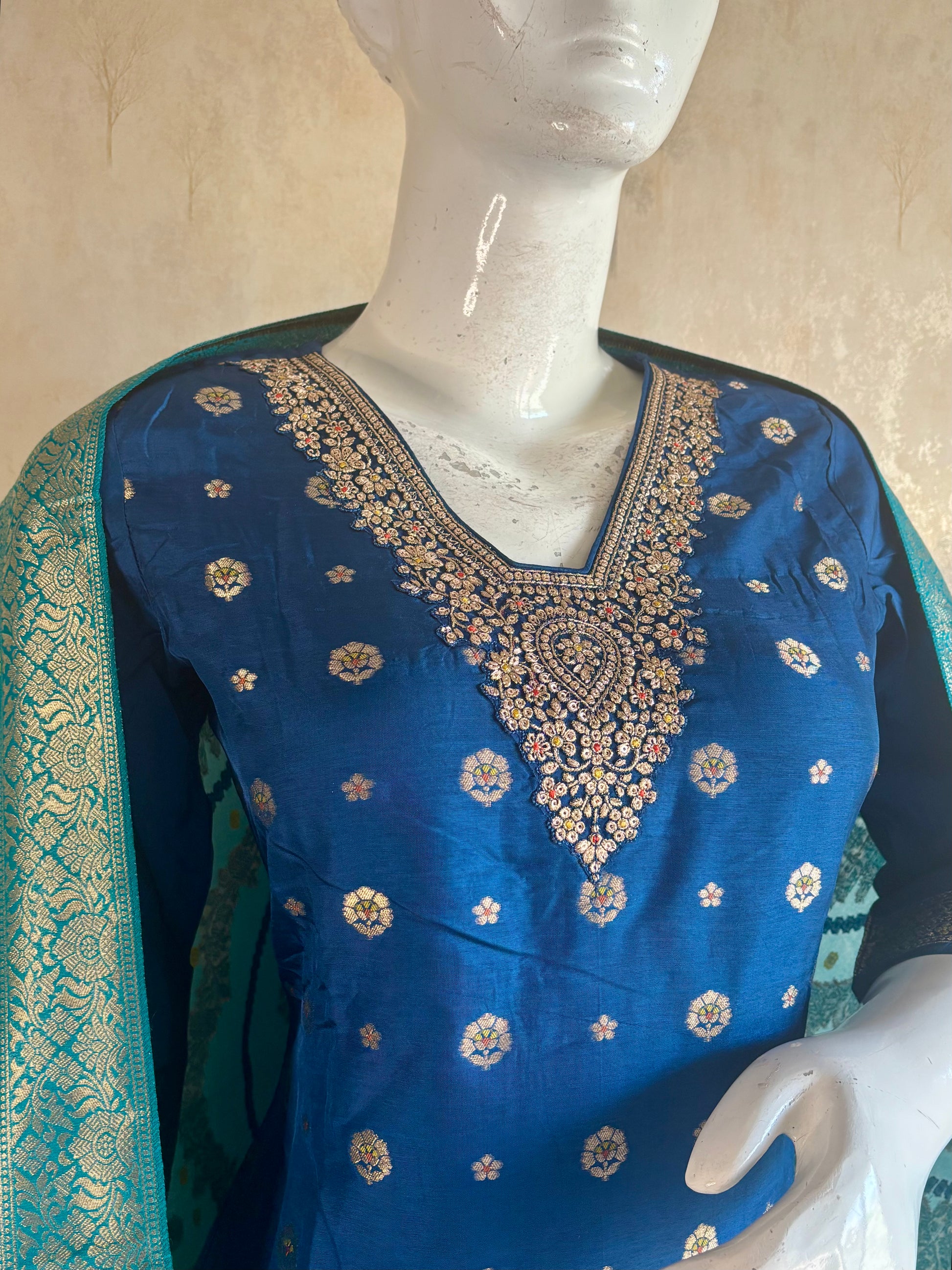 Make a statement with this regal royal blue Banarasi silk kurta set, designed for festive occasions and celebrations. The kurta features rich, heavy embroidery on the neckline, adding a touch of grandeur and intricate craftsmanship. Paired with elegant plain pants for balance, the highlight of this ensemble is the luxurious Banarasi dupatta in a striking contrasting firozi shade, woven with traditional motifs for a royal finish. Perfect for weddings, festivals, and special gatherings, this set blends timeless tradition with refined elegance.