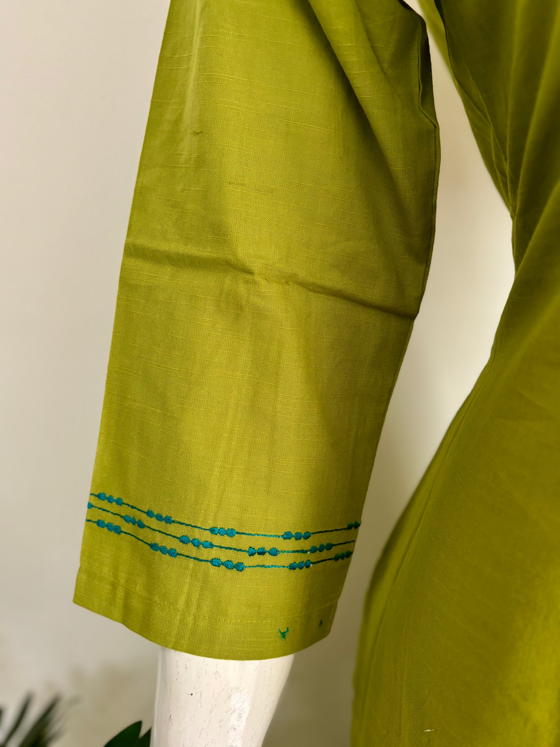 Neck & Sleeves: Features a V-neckline adorned with contrasting thread embroidery, which also decorates the sleeves—offering a harmonious, artisanal touch.